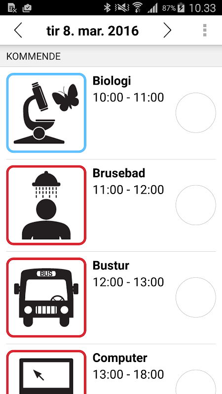 I DayTimer Family indstilles aktiviteterne og visningen til hvert familiemedlem, fx ikonstørrelser, aktivitetsure, færdig-knapper og mængden af information.