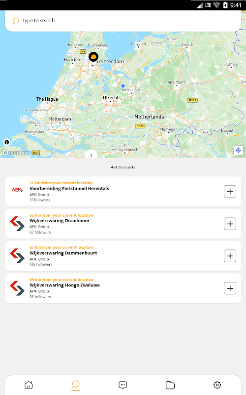 - Suchen & Folgen: Finden Sie Projekte oder Bauunternehmen und fügen Sie sie Ihren Favoriten hinzu.