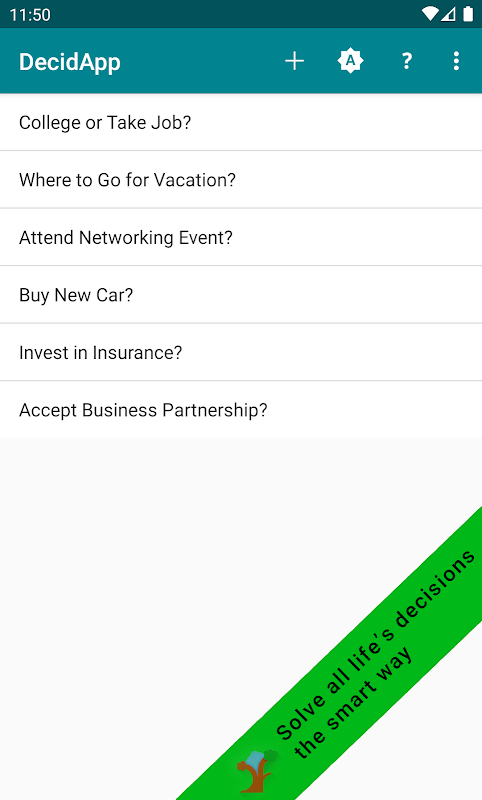 Mit Leichtigkeit bessere Entscheidungen treffen – Entdecken Sie DecidApp, die ultimative Entscheidungs-App, die Ihnen die Möglichkeit gibt, schnellere und bessere Entscheidungen mit weniger Stress zu treffen. Ganz gleich, ob Sie über persönliche Angelegenheiten oder wichtige Geschäftsentscheidungen entscheiden, nutzen Sie die Leistungsfähigkeit von Entscheidungsbäumen, um komplexe Entscheidungen souverän zu meistern.
