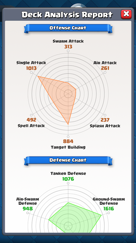 Wie wir wissen, ist eine ausgewogene Clash Royale Kampf Deck zusammen immer der Schlüssel für den Erfolg im Kampf Royale. Deck Analyzer jede Schlacht Deck im Detail analysieren und versorgen Sie mit allen den wichtigsten Informationen über eine gut ausgewogene und leistungsstarke Kampf-Plattform zu schaffen. Deck Analyzer auch sparen Sie viel Zeit von Versuch und Irrtum und Blindversuche, wenn neue Schlacht Decks Gebäude in Clash Royale.