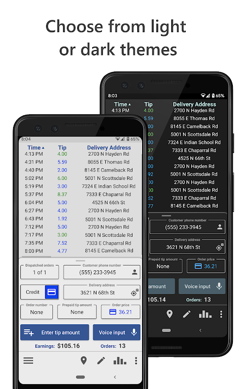 Diese App macht alles. In Eile? Geben Sie einfach den Trinkgeldbetrag ein und es werden automatisch die Lieferadresse, die Fahrstrecke und der Kilometerstand ermittelt. Willst du mehr Funktionalität? Wenn Sie etwas tiefer graben, finden Sie eine Vielzahl von Funktionen. Geben Sie eine Adresse ein, um eine Turn-by-Turn-Navigation zu erhalten. Geben Sie die Telefonnummer eines Kunden ein und Sie können ihn per Knopfdruck anrufen. Bestellen Sie die Bestelldetails vorab, wenn Sie mehrere Bestellungen gleichzeitig annehmen. Verwenden Sie benutzerdefinierte Sprachfunktionen für schnelle Benutzereingaben. Speichern Sie Kundeninformationen, einschließlich Telefonnummern, Namen, Notizen und früheren Bestellungen. Verfolgen Sie Ihre geleisteten Arbeitsstunden und Kilometerstände für jede Schicht.