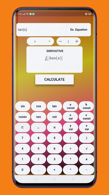 1.Öffnen Sie die App und schreiben Sie die Gleichung, wählen Sie die Variable und den Wert mit der Tastatur des Ableitungsrechners aus