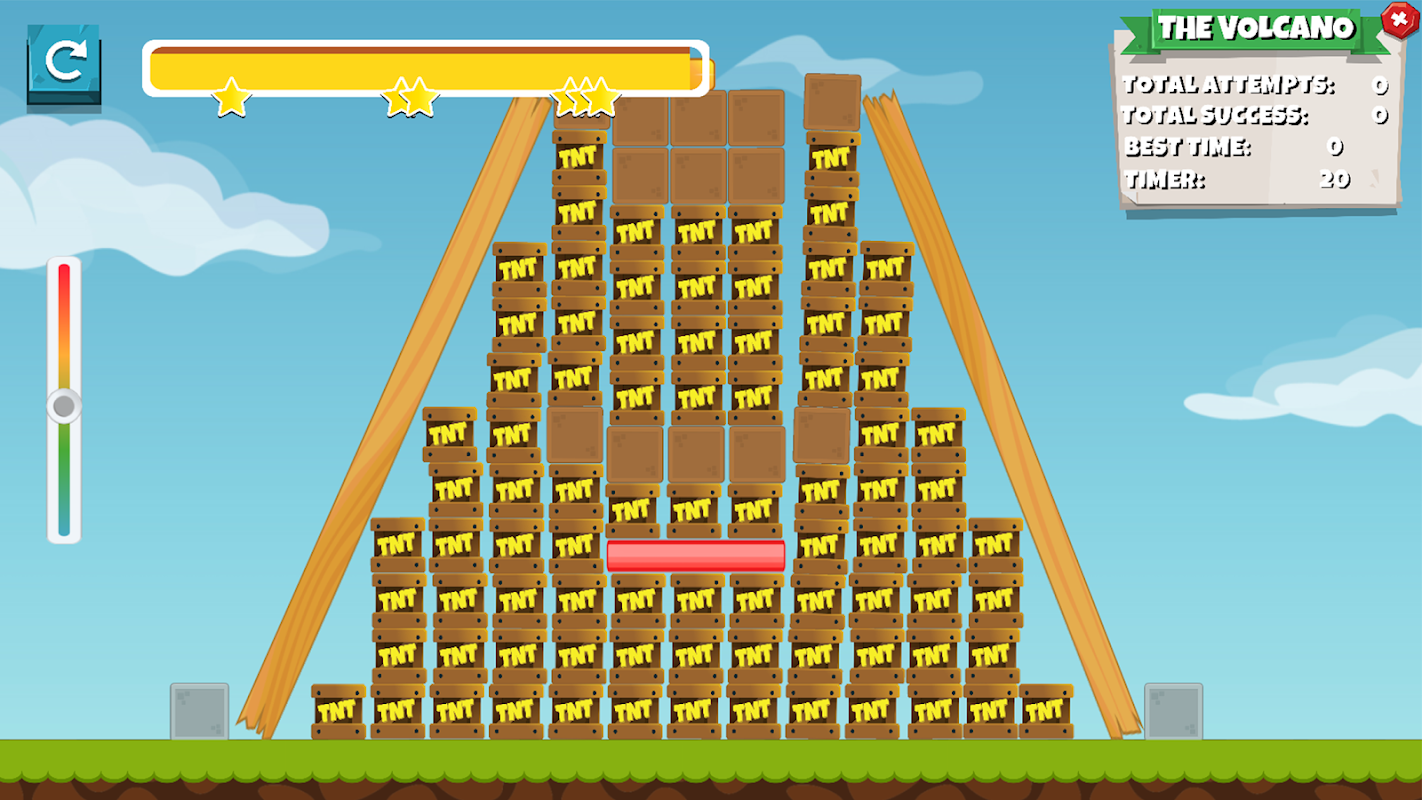 The aim of the game is to get the gold block to rest on the Red Pad by clicking on the TNT Boxes... remember to take the energy bar into consideration on the left hand side. Once the gold block lands on the pad it will turn Green and so unlock the next level.
