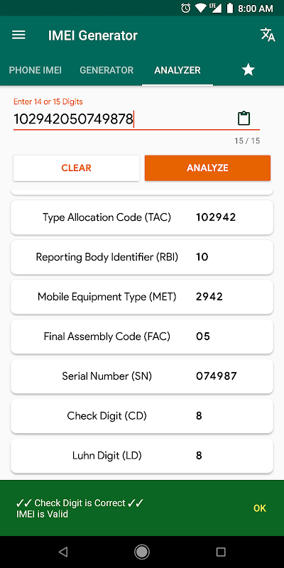✔ Mit dem Reiter „ANALYSATOR“ können Sie die IMEI einzeln analysieren und prüfen, ob sie gültig ist.