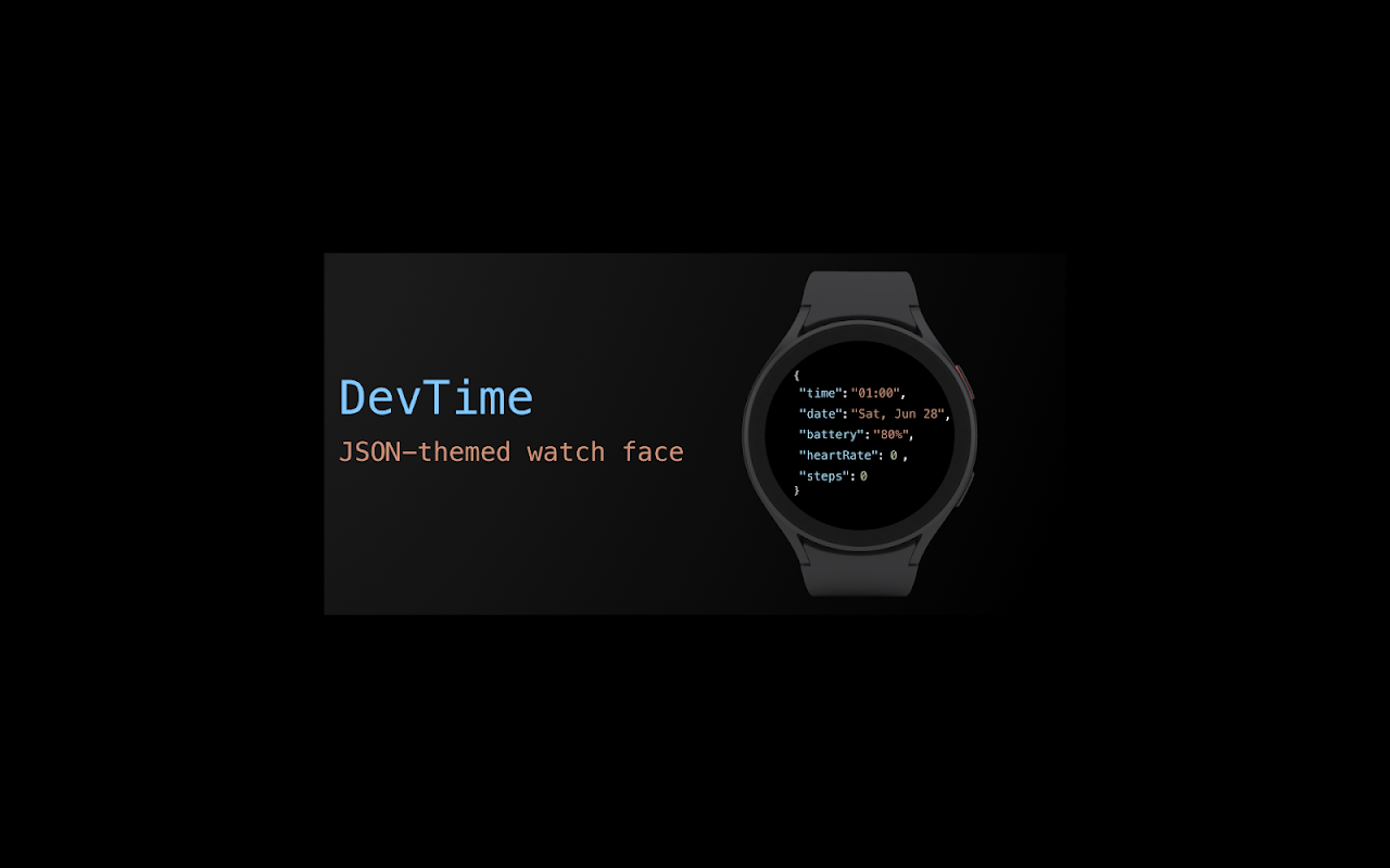 Ein sauberes JSON-Zifferblatt im Entwicklerstil für Wear OS. Dunkel. Minimalistisch. Präzise.
