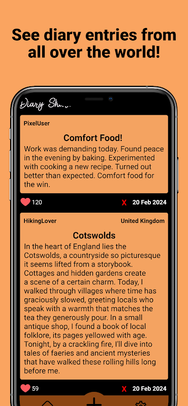 Navigieren Sie durch ein globales Tagebuch und entdecken Sie Einträge aus verschiedenen Ländern. Filtern Sie nach Standort, um eine virtuelle Reise zu unternehmen und die Welt bequem von zu Hause aus zu erleben. Diary Share ist nicht nur eine App; Es ist ein Fenster zur Welt, das endlose Inspiration und Verständnis bietet.