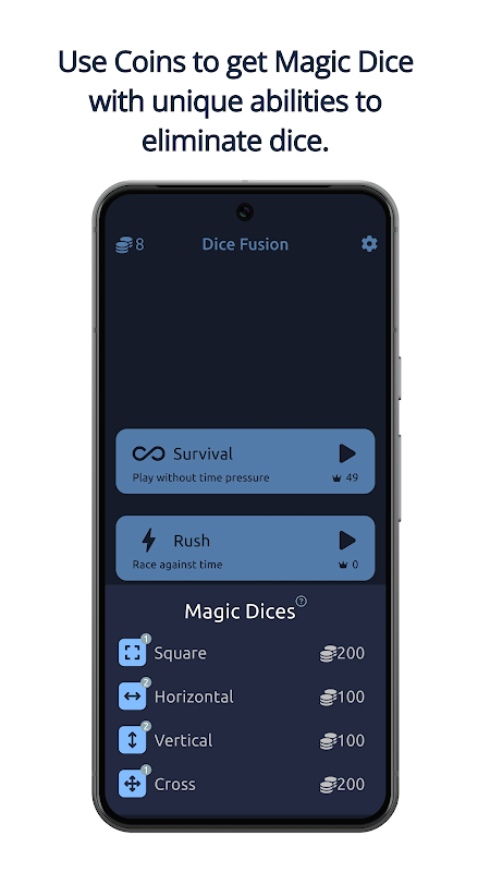 Verwende die verdienten Münzen, um **magische Würfel** zu kaufen. Diese verfügen über einzigartige Fähigkeiten, um Würfel auf dem Spielbildschirm auf verschiedene Weise zu eliminieren.