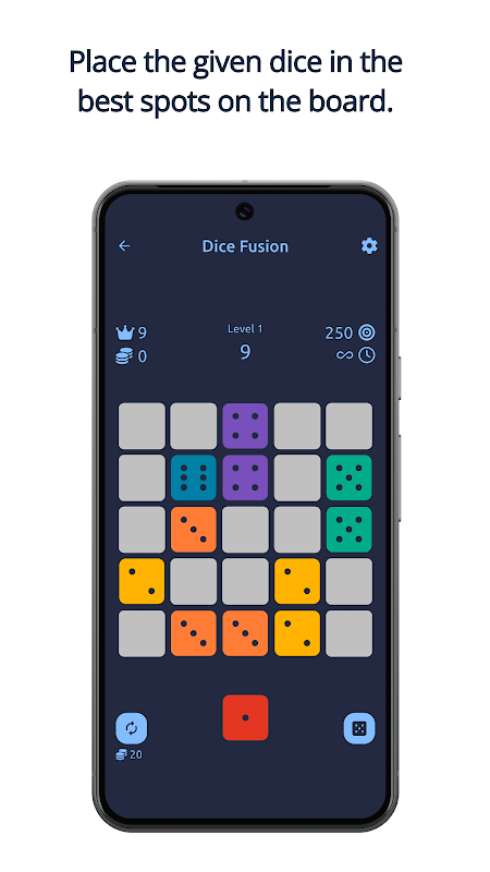 Dice Fusion ist ein unterhaltsames Strategiespiel, das auf einem 5x5-Brett durch Ziehen und Platzieren von Würfeln gespielt wird. Ziel ist es, Würfel mit gleichem Wert horizontal oder vertikal zu kombinieren, um einen Würfel mit höherem Wert zu erhalten. Beispielsweise ergeben drei nebeneinander liegende 3er eine 4. Werden drei 6er kombiniert, explodieren sie und eliminieren sich selbst und die umliegenden Würfel!