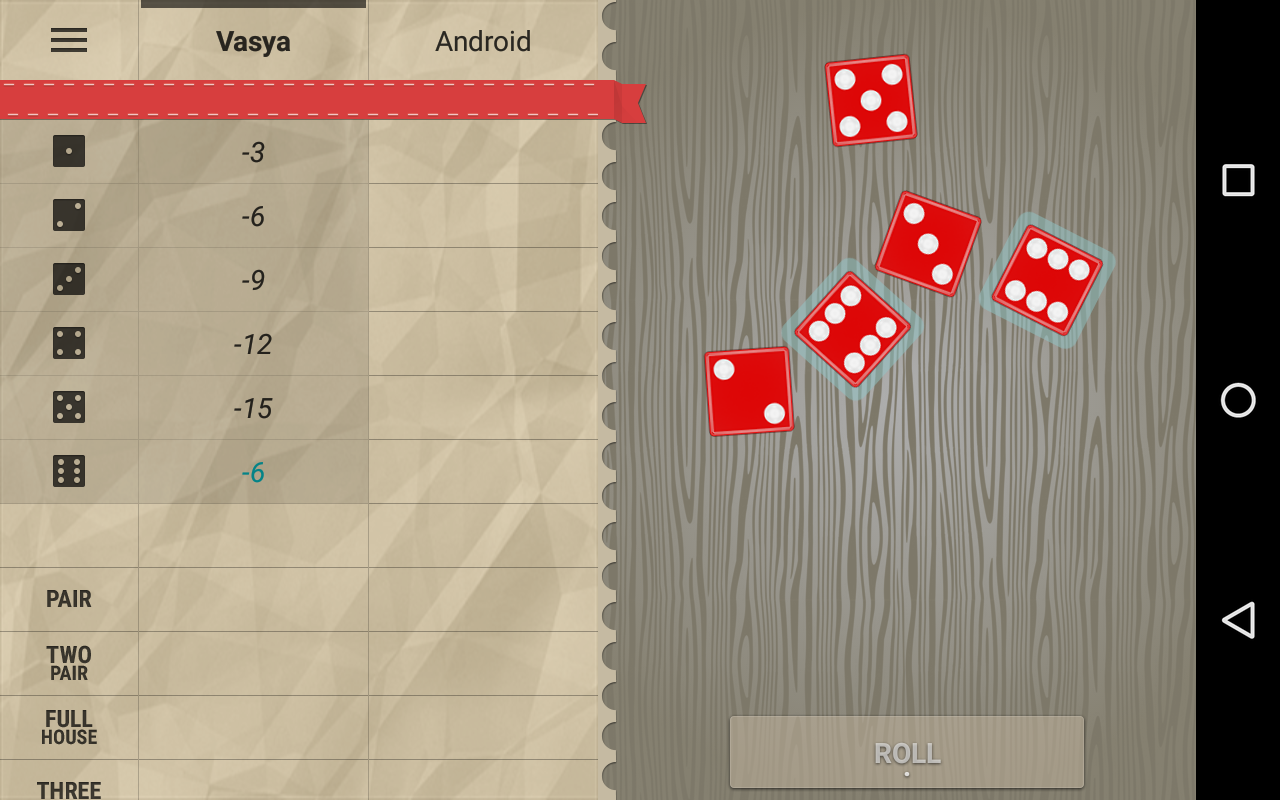 Zwei Würfelspiele für Unternehmen: Poker (ähnlich dem Würfelspiel Yahtzee) und 1000 (Eintausend). Bis zu 6 Personen auf einem Gerät und bis zu 4 Personen online. Auch gegen Android-Geräte spielbar. Die App bietet eine ausführliche Beschreibung der Spielregeln mit Beispielen. Für Anfänger gibt es eine Hilfefunktion.