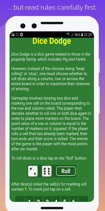 Das Spiel besteht darin, zwei Würfel zu werfen und ein Feld auf dem Spielfeld zu markieren, das der gewürfelten Zeile und Spalte entspricht. Anschließend entscheidet der Spieler, ob er einen oder beide Würfel erneut wirft, um weitere Marker auf dem Spielfeld zu platzieren. Der Punktwert einer Zeile oder Spalte entspricht der Anzahl der Marker im Quadrat. Würfelt der Spieler ein bereits markiertes Feld, endet sein Zug und seine Punktzahl wird gezählt. Gewinner ist der Spieler mit den meisten Punkten nach sechs Runden.