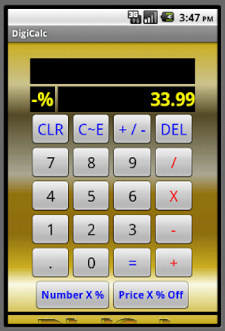 Dies ist ein einfacher Taschenrechner, den Sie addieren, subtrahieren, multiplizieren und dividieren können. Es tut Dezimalzahlen als auch. Sie können eine versehentlich eingegebene Ziffer zu löschen. Sie können eine Fehlerzeile zu löschen, oder können Sie einfach das Display zu löschen und neu zu beginnen. Dieser Rechner verfügt über eine zusätzliche Einkaufen Prozent Aus-Taste. Was gibt einen zwei Dezimalstellen Preis. Zum Beispiel, wenn etwas wird regelmäßig auf 39.99 preislich Sie eingeben, dass im Rechner dann drücken Sie die X (mal) Funktionstaste; geben Sie den Prozentsatz aus als Zahl - z.B. 15 (15%); Sie drücken Sie dann die "Preis X% Off" -Taste und es wird den Betrag, den Sie tatsächlich zahlen zurück! In diesem Fall 33,99, meine Frau denkt, es ist glatt, wenn sie einkaufen geht und hat eine Rabatt-Karte oder Coupons (Es war ihre Idee).