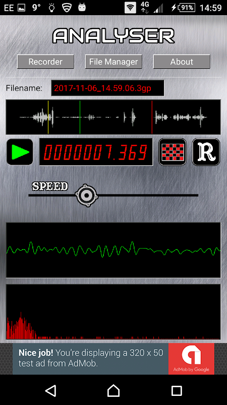 Das ist auch ein Analysator Bildschirm, in dem Sie einen Start einstellen und Position stoppen, und die Tonhöhe / Geschwindigkeit der Wiedergabe ändern.