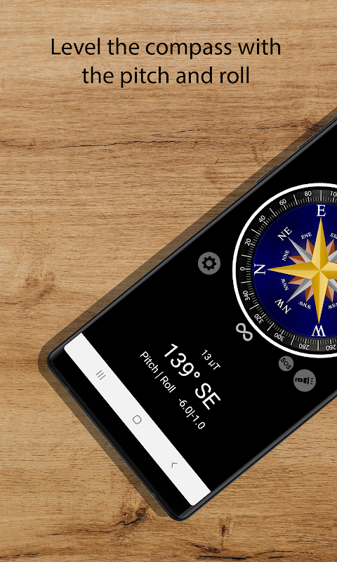 Diese Anwendung zeigte dem Benutzer mithilfe der Magnetfeld- und Beschleunigungssensoren den magnetischen Kurs. Außerdem werden dem Benutzer die Nick- und Rollparameter angezeigt, um das Smartphone so einzustellen, dass es die richtige Ausrichtung findet. Diese Parameter ändern ihre Farbe in Grün, wenn das Smartphone horizontal ausgerichtet ist, und werden am unteren Bildschirmrand angezeigt. Die Ausrichtung wird durch einen simulierten analogen Kompass angezeigt. Zusätzlich verfügt die App über eine Taschenlampenfunktion, die so konfiguriert werden kann, dass sie ein SOS-Signal sendet. Damit der Kompass ordnungsgemäß funktioniert, muss Ihr Gerät über Beschleunigungsmesser und Gyroskopsensoren verfügen.
