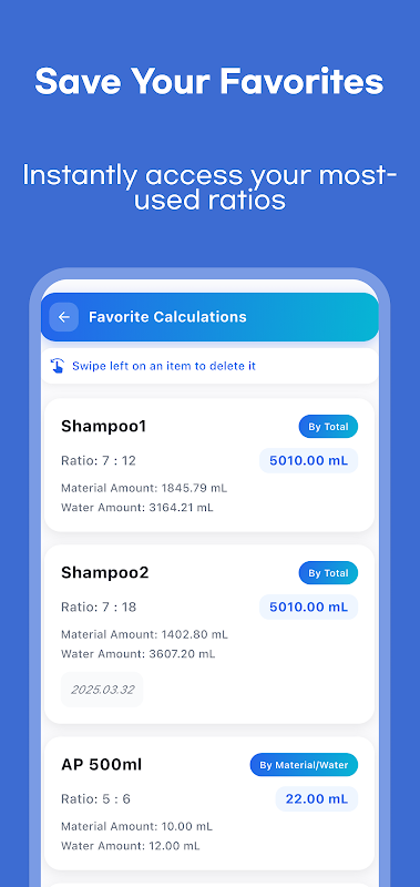 - Einheitenumrechnung (Liter/Milliliter): Wandeln Sie Einheiten zwischen Litern (L) und Millilitern (mL) mühelos um, um flexible Eingaben zu ermöglichen.