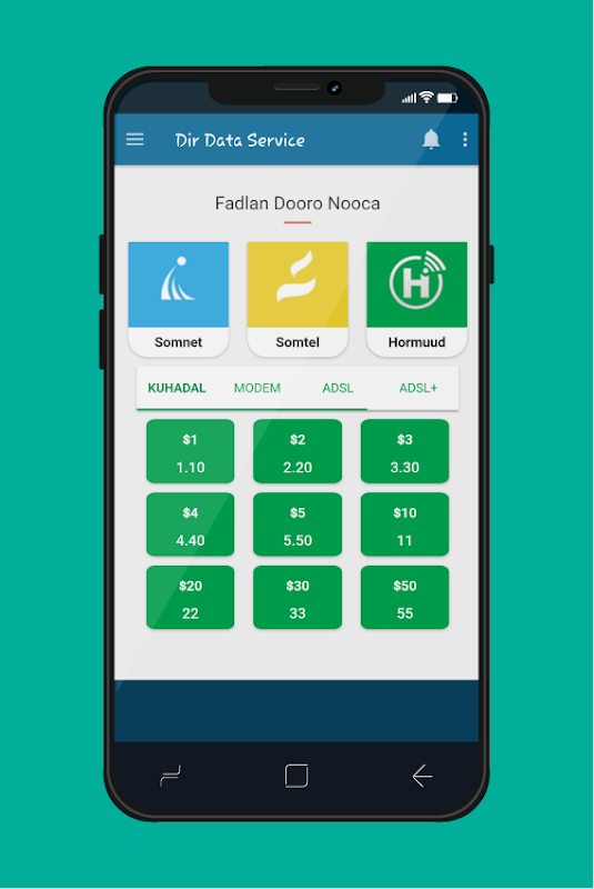 Waxaad ka iibsan kartaan xirmooyinka SomNet. Hada kadib uma baahnid in aad cid la hadashid ama qarash telefan ku bixisid si laguugu shubo xirmo SomNet hadii aad isticmaashaan Dir Data Service app. Sidoo kale ka waxaad ka heli doontaa Adeegyada EVC Plus, ANFAC iyo Artimet