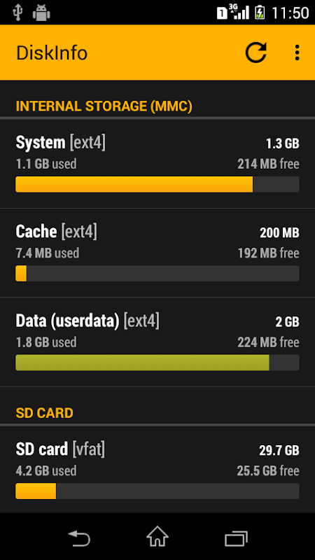 DiskInfo is a unique app that lists all partitions and all mount points on you device. It shows disk usage and very detailed partition and storage information. It also displays total and free memory (RAM) and Swap (e.g. zRam).