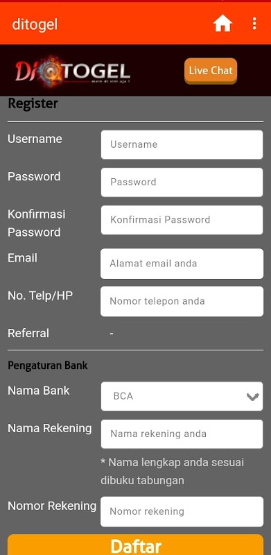 Melakukan pasang togel bersama Ditogel.com sangat mudah dan gratis. Harap masukan data-data dengan sesungguhnya untuk kemudahan bertransaksi dengan kami. ID dan password akan dikirimkan ke kontak yang tertera ketika mendaftar, atau anda juga dapat menghubungi kami lewat Livechat dan kontak yang tersedia.