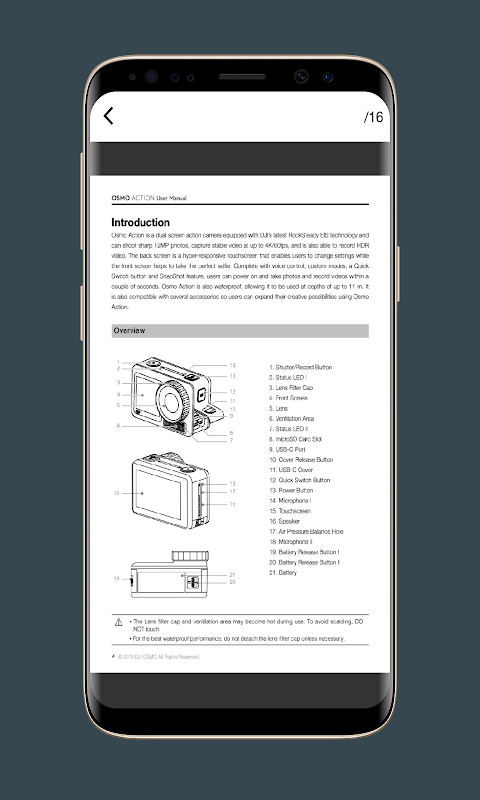 Die DJI Osmo Action Guide-Anwendung enthält viele Informationen und Funktionen des DJI Osmo Action, die Sie klar und einfach abrufen können. Über die DJI Osmo Action Guide-Anwendung können Sie sich ein Video des DJI Osmo Action ansehen, das Ihnen die Möglichkeit gibt, das Erscheinungsbild und die Funktionen des DJI Osmo Action Guide zu sehen. Er hat auch viele verschiedene Funktionen, einschließlich Dual Screens: Dual Screens in Mit Osmo Action können Sie alles auf Knopfdruck erfassen. Mit dem hellen vorderen Bildschirm können Sie sich mühelos überall einrahmen, während der hintere Bildschirm ein ultraklares, extrem reaktionsschnelles Display bietet