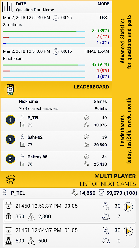 The first and only one game which allows you to compete with other players. Bet your coins, answer questions - climb up in ranking, check your last game results or daily/weekly/monthly leaderboards. No more boring learning.