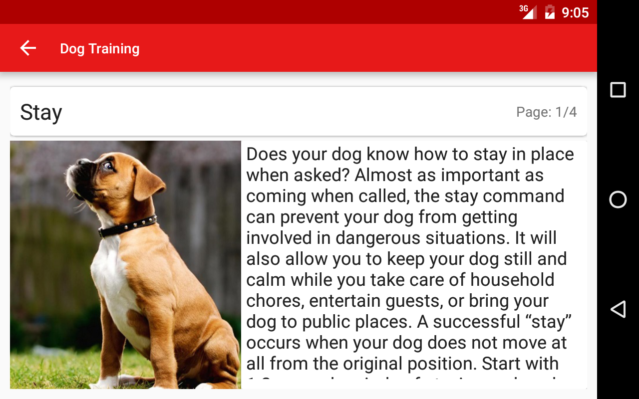 Finally you have a dog! Looking for how to train him? Use this simplest dog training app. Teach your dog how to listen, sit, lie down, stay at a place, roll over, fetch or heel with this application. Get real time weather from within the application to plan your outdoor training.