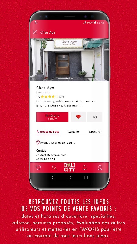 DoliCity est votre application qui répertorie les bars, restaurants, hôtels et événements en République Centrafricaine. C'est la référence pour trouver tous les bons plans du moment. Elle permet à ses utilisateurs de découvrir de nouveaux points de vente, de rechercher et de trouver les bonnes adresses, de connaître les lieux branchés du moments et les événements ou soirées à ne pas rater.