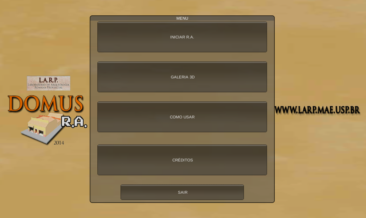 Entwickelt von dem Team von Archäologen des Labors für Archäologie Roman Provincial Museum für Archäologie und Ethnologie der Universität von São Paulo, ist DOMUS RA ein Bildungs-Anwendung, die es dem Benutzer, in Augmented Reality beobachten, ein antikes römisches Haus (domus) und navigieren Sie durch einen erlaubt 3D-Objekte Galerie und mehr Informationen von den Zusatztexte von unserem Team geschrieben.