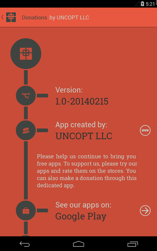 Unterstützung UNCOPT LLC Android-Entwickler und ihnen helfen, bringen Sie kostenlose Apps durch Spenden mit diesem engagierten Spenden App. Spenden werden mit In-App-Zahlungen.
