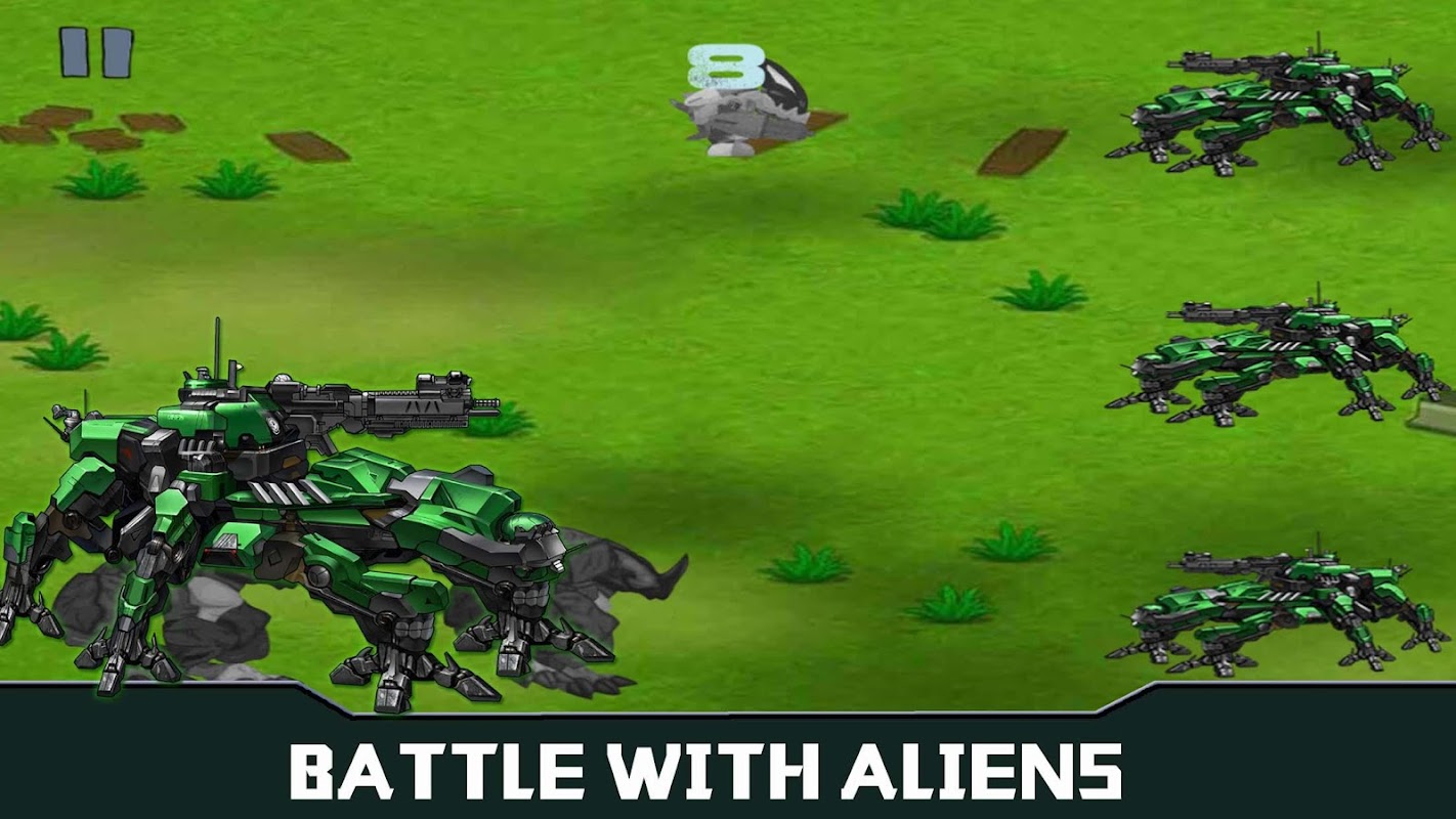 » Frontline Defence: Außerirdische Monster dringen in unsere Heimat ein. Du! Robotermeister, bereite deine Truppen vor und verteidige unsere Heimat mit drei Robotern.