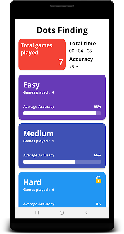 You can see statistics of the total game you played, total time you played and your accuracy. Step by step you can chose easy, medium and hard levels.