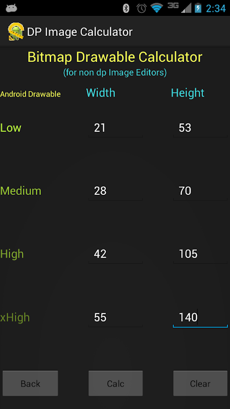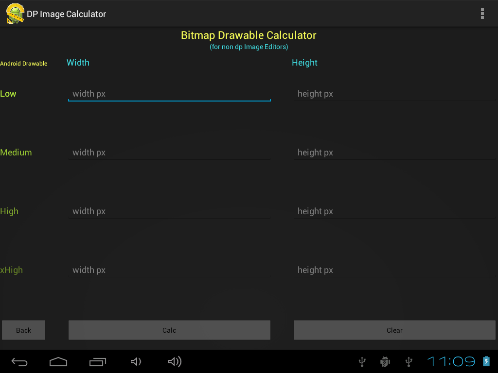 Calculate the size in pixels for your image to correspond to Density-independent Pixels for Android Developers. Simply supply a width and a height in pixels and the calculator will calculate the low (drawable-ldpi), medium (drawable-mdpi), high (drawable-hdpi) and extra-high (drawable-xhdpi) sizes. The various sized low, medium, high and xhigh will scale automatically corresponding to dp-to-pixel ratio, thereby making it easier to scale your images for Android. The application accepts a single width and height in any of the size categories, so if you have created your initial image and you want it to only be a certain height for xhdpi size, but need to only have it 20 pixels wide for the ldpi, you can put in each of those dimensions and the rest will be calculated for you.
