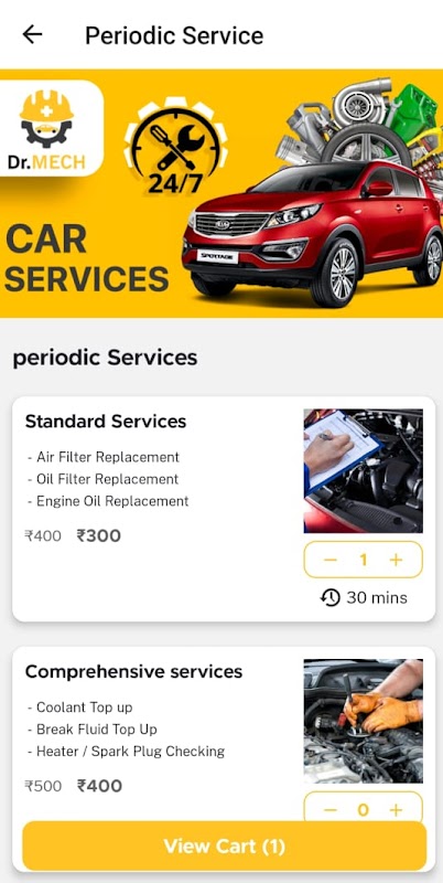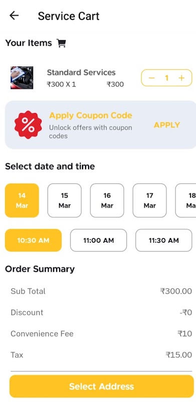 Auf der Startseite der Kundenanwendung können Sie die verschiedenen angebotenen Dienste sehen und einen davon auswählen oder nach diesen Diensten suchen. Es können sogar mehrere Dienste gleichzeitig gewählt werden. Fügen Sie die von Ihnen ausgewählten Dienste Ihrem Warenkorb hinzu. Sie können Ihre Adresse und alle Coupons, die Sie haben, hinzufügen, um ein Angebot für Ihre Dienstleistungen auf der Warenkorbseite anzunehmen. Danach können Sie mit den angebotenen Methoden bezahlen, wie Sie möchten. Ihr Service wird bestätigt und geplant, nachdem die Zahlung eingegangen ist. Der einfachste Weg, um Service für Ihr Auto zu erhalten, ist auf diese Weise.