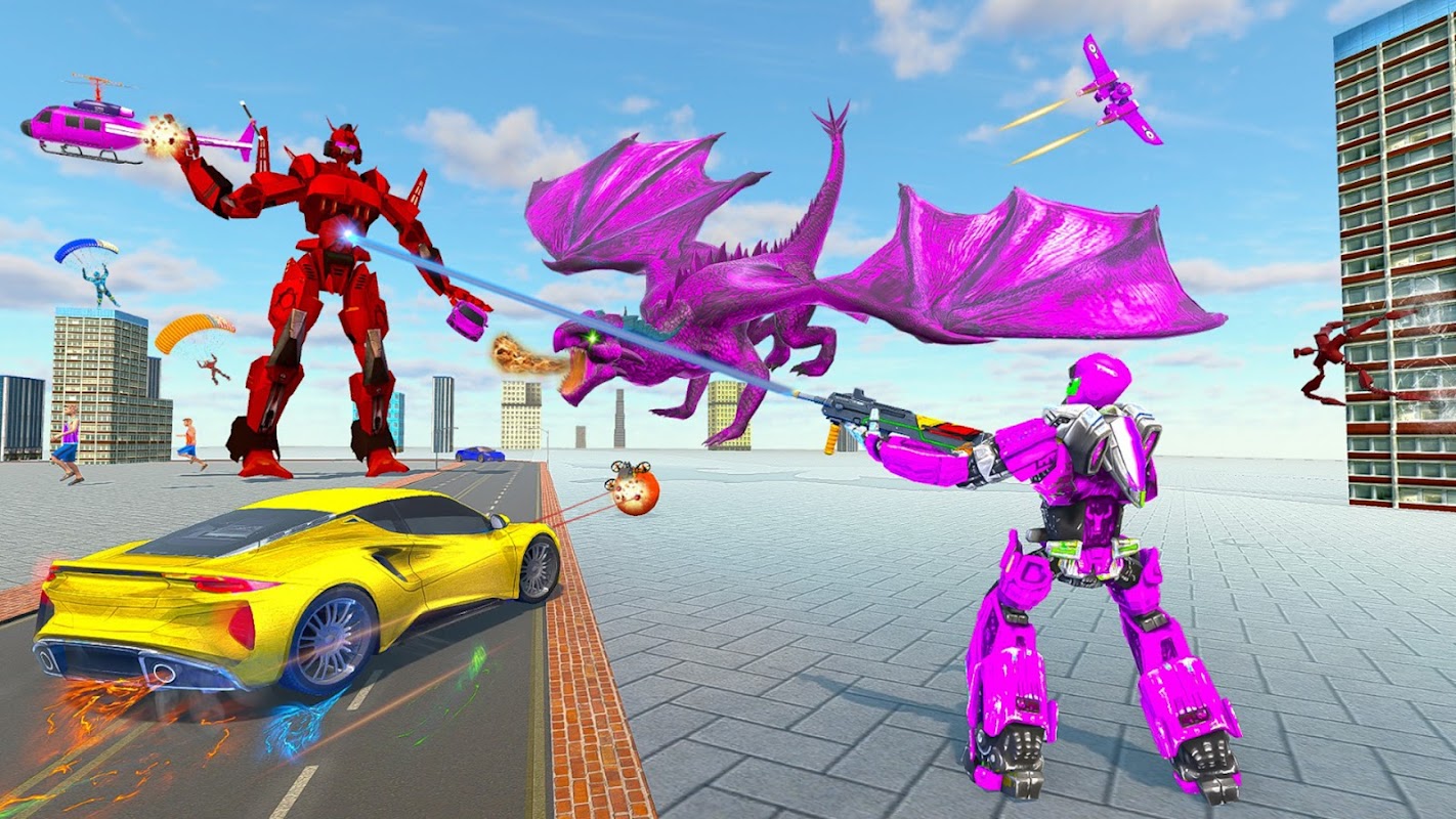 Begeben Sie sich auf eine epische Reise eines transformierenden Roboterspiels und betreten Sie die epische Welt von Dragon Robot! Als oberster Wächter der Stadt verkörpern Sie einen bemerkenswerten Drachenroboter, der sich in verschiedene Formen verwandeln kann, beispielsweise in einen Jet, ein Auto, einen Drachen und mehr. Bewaffnet mit einer Vielzahl von Superkräften und modernsten Waffen besteht Ihre Mission darin, gefährliche Bedrohungen zu beseitigen und die Sicherheit der Stadt in diesem Multi-Roboter-Auto-Transformer-Spiel oder fliegenden Roboter-Auto-Spiel zu gewährleisten.