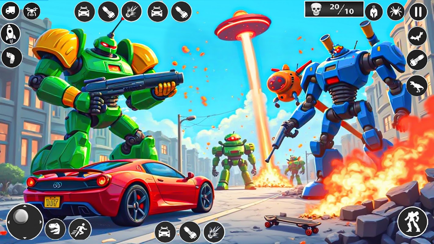 Erkunde eine große Stadt, in der du mit deinem Roboterauto Rennen fahren oder als Drachenroboter fliegen kannst. Erlebe viele herausfordernde Missionen und kämpfe gegen Flugroboter und Gegner am Boden. Dieses Spiel vereint die besten Roboterautospiele und Flugroboterkämpfe in einem spannenden Abenteuer.