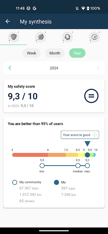 DriveQuant berücksichtigt die Eigenschaften Ihres Fahrzeugs und die Fahrtbedingungen (Verkehr, Wetter, Straßenprofil). Profitieren Sie von einer zuverlässigen Bewertung Ihrer Fahrkünste und einem Vergleich mit Fahrern, die Ihnen ähnlich sind (Fahrzeugtyp, Fahrtentyp usw.).