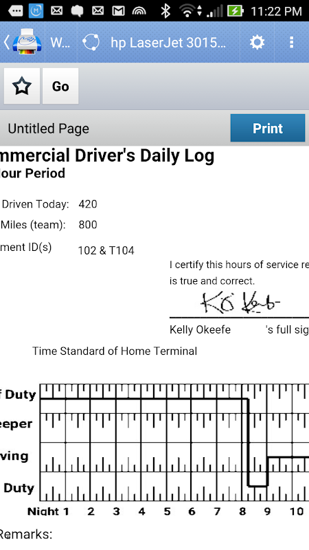 Drivers Daily Log für Android sammelt Ihre Protokolleinträge mit einer Schnittstelle, die dem standardmäßigen Papierprotokoll nachempfunden ist. Es ist ein sehr einfach zu bedienendes tägliches Fahrtenbuch des Fahrers. Drucken Sie ganz einfach direkt von Ihrem Gerät auf jedem Wi-Fi-, Bluetooth-, USB- oder freigegebenen Wi-Fi-Drucker. Oder senden Sie Ihr tägliches Fahrerprotokoll per E-Mail. Drucken Sie vor der Installation des aktuellen Updates frühere Protokolle aus, da die neue Druckfunktion des Updates nicht automatisch darauf zugreift.
