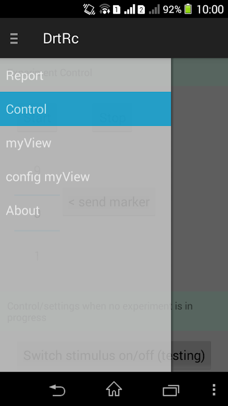* Steuerung: In diesem Bildschirm können Befehle an das Arduino DRT-Gerät zu senden. B. Start / Stopp. Oder schalten Reiz auf, wenn kein Versuch läuft, um das Setup zu testen. Versuchsbedingungen kann auch mit Markern versehen werden. ZB senden Marker "1" zu kennzeichnen, dass die Themen ist jetzt in Lage "1".