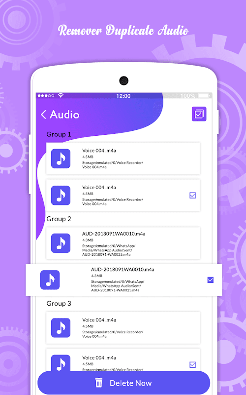 Mit dieser App können Sie doppelte Dateien auf Ihrem Telefon entfernen. Um doppelte Dateien auf Ihrem Telefon zu entfernen, müssen Sie bestimmte Dateien wie Audio, Video, Dokumente und Bilder auswählen. Nachdem Sie bestimmte Elemente ausgewählt haben, müssen Sie auf die Schaltfläche Jetzt scannen klicken. Wenn Sie auf die Schaltfläche Jetzt scannen klicken, beginnt die Anwendung automatisch mit dem Scannen doppelter Dateien in Ihrem Telefon. Zeigen Sie dann die Scanergebnisse gruppenweise an. Bedeutung Wenn Sie für das Bild die Option zum Entfernen von Duplikaten auswählen und zwei verschiedene Bilder mit dem Duplikatbild gefunden werden, zeigen Sie zuerst Gruppe 1 und dann Gruppe 2 an. Zeigen Sie in beiden Gruppen zuerst das Originalbild und dann das Duplikatbild an. Das doppelte Bild des Telefons wird mit einem Häkchen angezeigt. Klicken Sie einfach auf die Schaltfläche Löschen, um doppelte Dateien zu entfernen. Wenn Sie die Datei nicht löschen möchten, können Sie auch die entsprechenden Optionen deaktivieren.