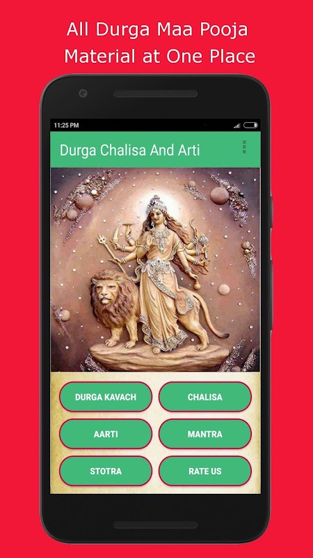Durga Chalisa App enthält Durga Maa Chalisa, Durga Mantra, Durga Kavach, Durga Stotra und Ambe Ma Aarti.