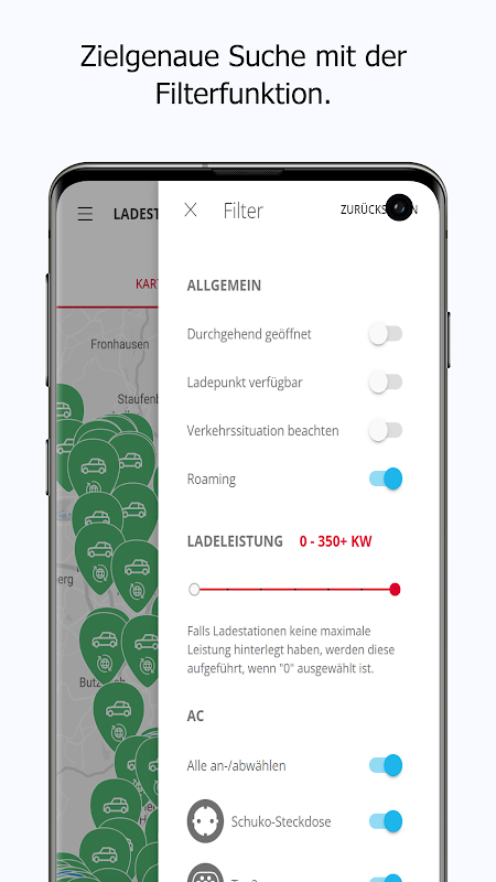 Die Übersichtskarte zeigt Ihnen alle für Sie zugänglichen Ladepunkte. Diese können Sie ganz einfach aus der App heraus freischalten. Sie sehen auch deren aktuelle Verfügbarkeit und erhalten Informationen zu möglichen Störungen.