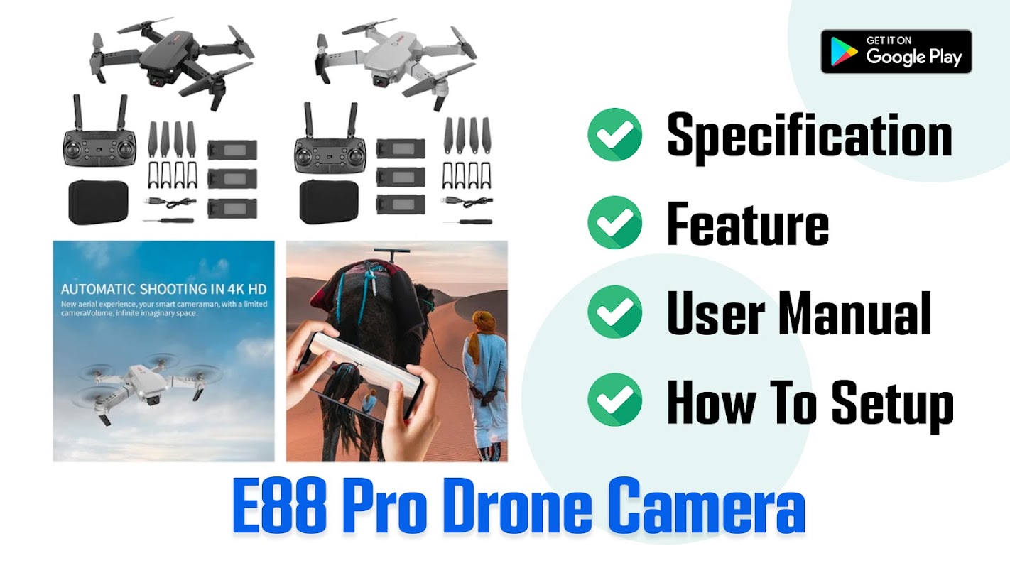 In dieser App finden Sie einige Anleitungen mit Informationen zu Spezifikationen und Funktionen der e88 Pro-Drohnenkamera sowie Anleitungen zur Verwendung und Einrichtung der e88 Pro-Drohnenkamera Schritt für Schritt.