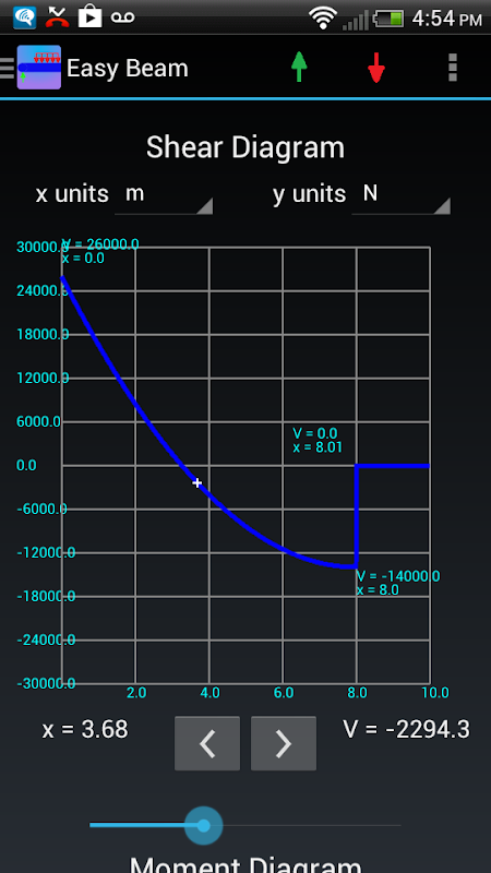 Interaktive Grafiken kann der Benutzer, um die Scherkraft und Biegemoment überall auf dem Balken festzulegen oder zu bestimmen, bei dem der maximale Durchbiegung in ihrer Riegel-Konstruktion erfolgen. Das ist, weil einfach Beam Grafik ermöglichen es dem Benutzer, eine Suchleiste verwenden, um einen Cursor auf den Graphen zu verschieben. Standardmäßig werden die Diagramme zeigen auch lokale min und max auf dem Bildschirm für Ihre Bequemlichkeit Werte.