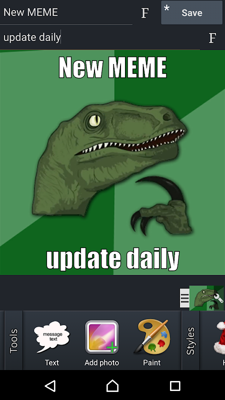 Mit "Easy Meme Maker" können Sie die lustigsten Memes erstellen und sie mit Ihren Freunden über Facebook, Twitter, Instagram, Google+, E-Mail, Dropbox, ... teilen.
