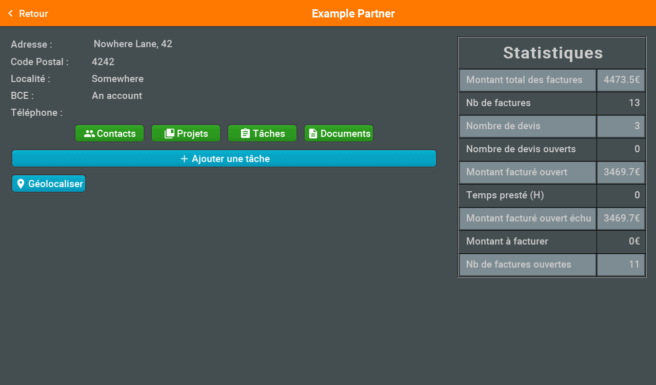 - Contactez vos partenaires par mail ou par téléphone d'un simple clic grâce au lien avec les applications dédiées de votre tablette ou de votre téléphone.