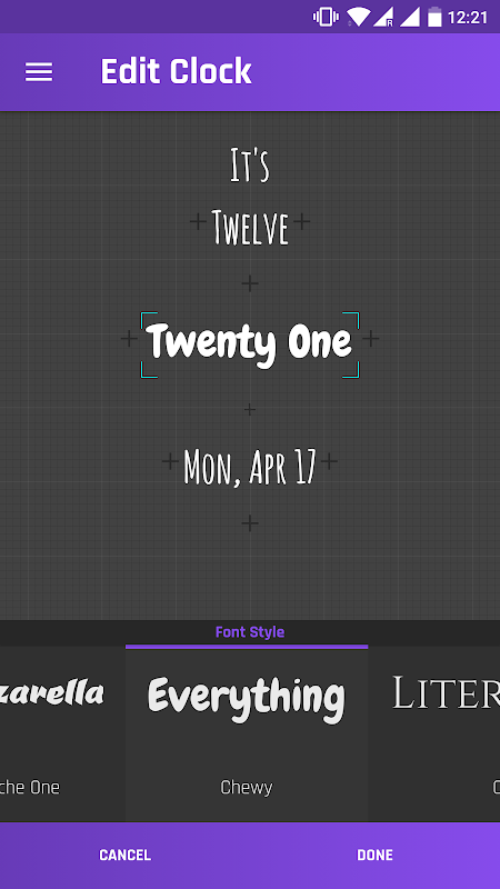 Dies ist nur eine textbasierte Uhr und keine Zeit in Ziffern zeigen. Keine Lust Features wie Wetter-Updates oder Kalenderintegration hinzugefügt werden, da diese App nicht für Berechtigungen stellen und halten Sie die App minimal nur Text individuell gestalten.