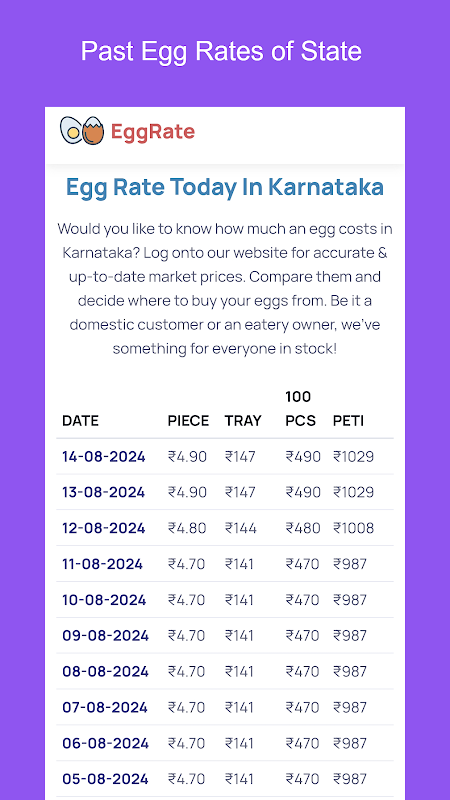 Mit der Egg Rate-App bleiben Sie über die genauesten und aktuellsten Eierpreise in verschiedenen Regionen Indiens auf dem Laufenden. Unabhängig davon, ob Sie Einzelhändler, Großhändler oder Verbraucher sind, bietet Ihnen diese Anwendung tagesaktuelle Informationen zu den Eierpreisen, sodass Sie fundierte Entscheidungen treffen können.