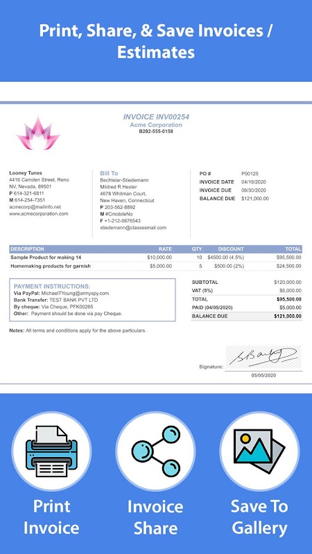 Die App erstellt ganz einfach eine professionelle Rechnung und einen Kostenvoranschlag. Es berechnet automatisch Steuern, Rabatte, den Gesamtbetrag und den zu zahlenden Betrag. Sie können auch Ihre Rechnungen und Kostenvoranschläge unterschreiben. Sie können auch zusätzliche Notizen, Bilder und Zahlungsdetails in Ihrer Rechnung/Kostenvoranschlag speichern. Mit der App können Sie Ihre Rechnungen und Kostenvoranschläge speichern, teilen und drucken.