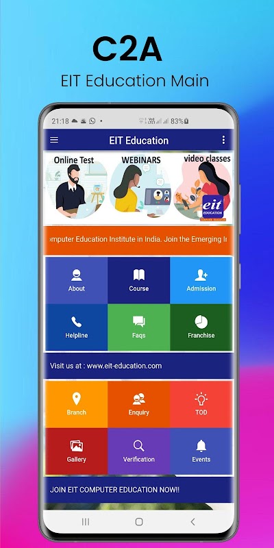 This application can be used as intermediate by the students in order to get enrolled into various courses .further this application can be used in a way to get all the details such as admission info, student status, receipt, pay-details on different courses and with this app student self verification is possible such as student verification, certificate verification, ALC verification and hr verification . through this application the student can get complete detail about his institution that is EIT Education. This app contains a diversified and categorised number of courses for ease of student. In addition to that students can get connected with faculties on a single click .