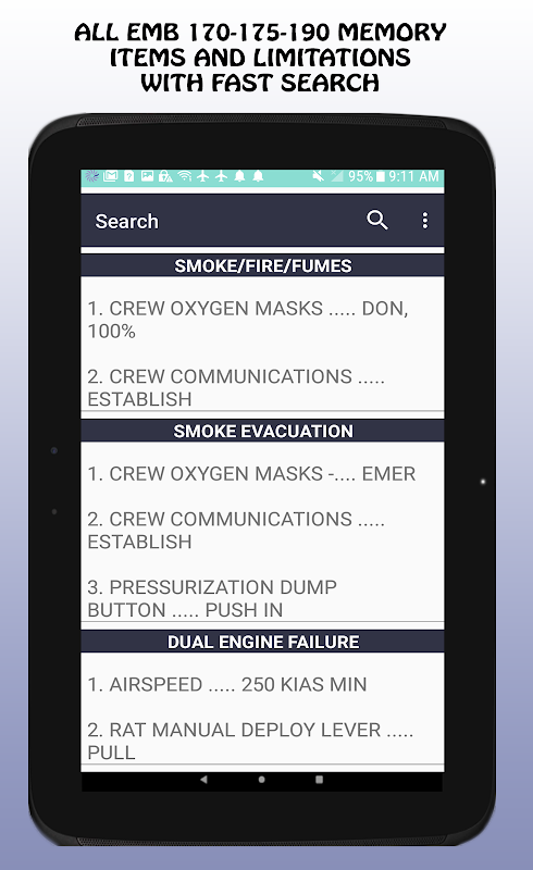 Allgemein, Luftsystem, Feuer, Treibstoff, Hydraulik, Enteisung, Fahrwerk & Bremsen, Sauerstoff, Steuerung, Elektrik, Warnsysteme, Autopilot, Triebwerk, Instrumente, Radar, FMS, APU, Einschränkungen, Standardarbeitsanweisungen (SOP) und Merkhilfen.