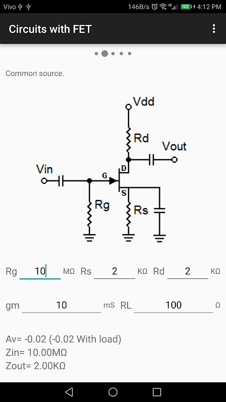 Unter Verwendung des vereinfachten H Modell und der FET-Transkonduktanz-Modell berechnet diese Anwendung die Spannungsverstärkung (Av), Eingangsimpedanz (Zin) und der Ausgangsimpedanz (Zout) des gemeinsamen Emitterwechselstromkreise, gemeinsamen Emitter ohne Bypass, gemeinsamen Kollektor, gemeinsame Basis, gemeinsame Quelle, gemeinsame Quelle ohne Bypass, gemeinsamen Drain- und gemeinsame Gate.