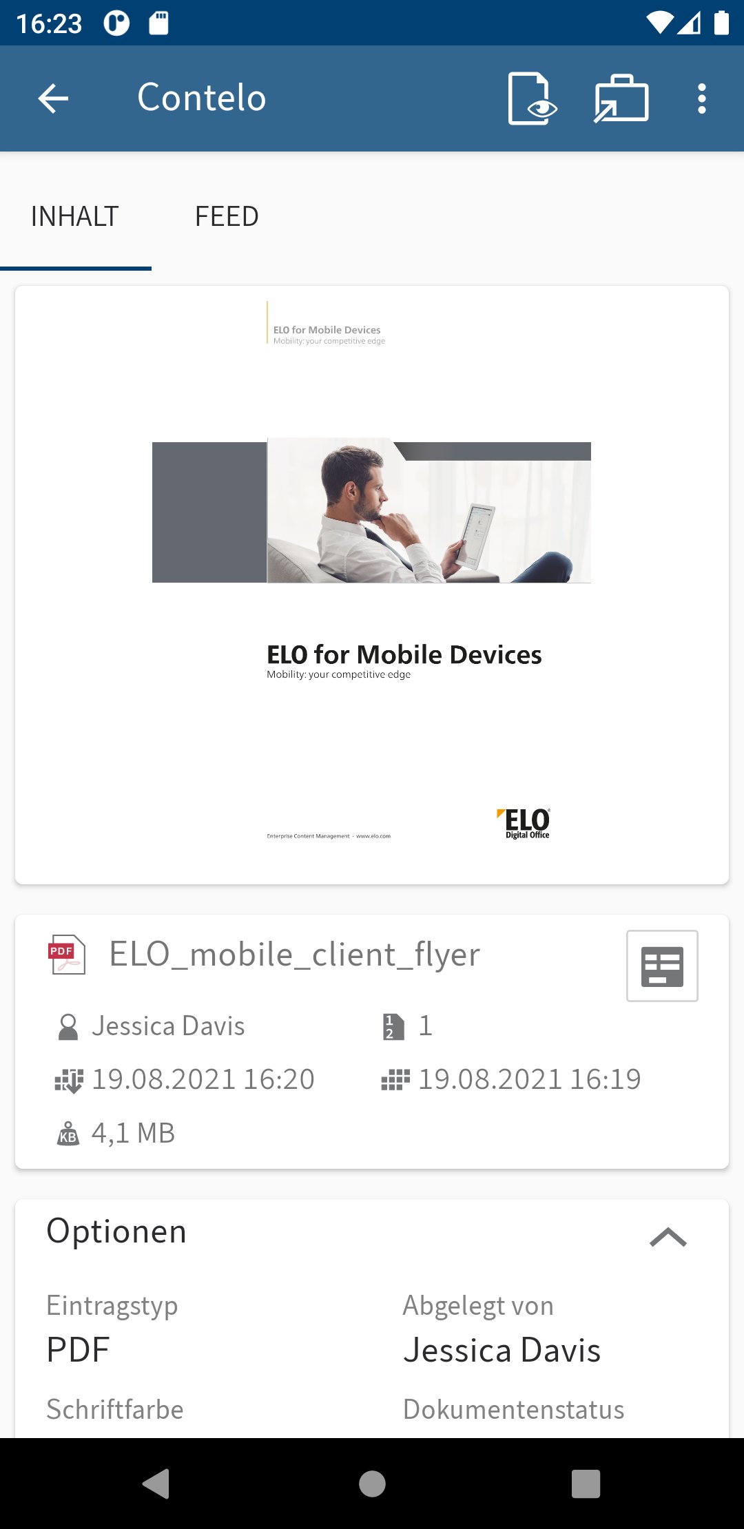 Mit der ELO App können Sie über mobile Endgeräte auf das ELO Repository Ihres Unternehmens zugreifen. Die App bietet Ihnen schnellen Zugriff auf Ihre Dokumente und die dazugehörigen Detailinformationen. Sie können Dokumente von unterwegs erfassen und ablegen, an Unternehmensprozessen teilnehmen und Informationen aus Ihrem ELO recherchieren.